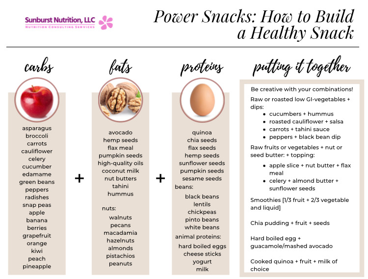 We need energy to do great things! It is not about going hungry, but keeping your body fed with nutrient dense foods so you feel your very best. Here are some snack ideas you can build on as you stock your pantry and fridge. I would love to hear ideas you come up with as well!